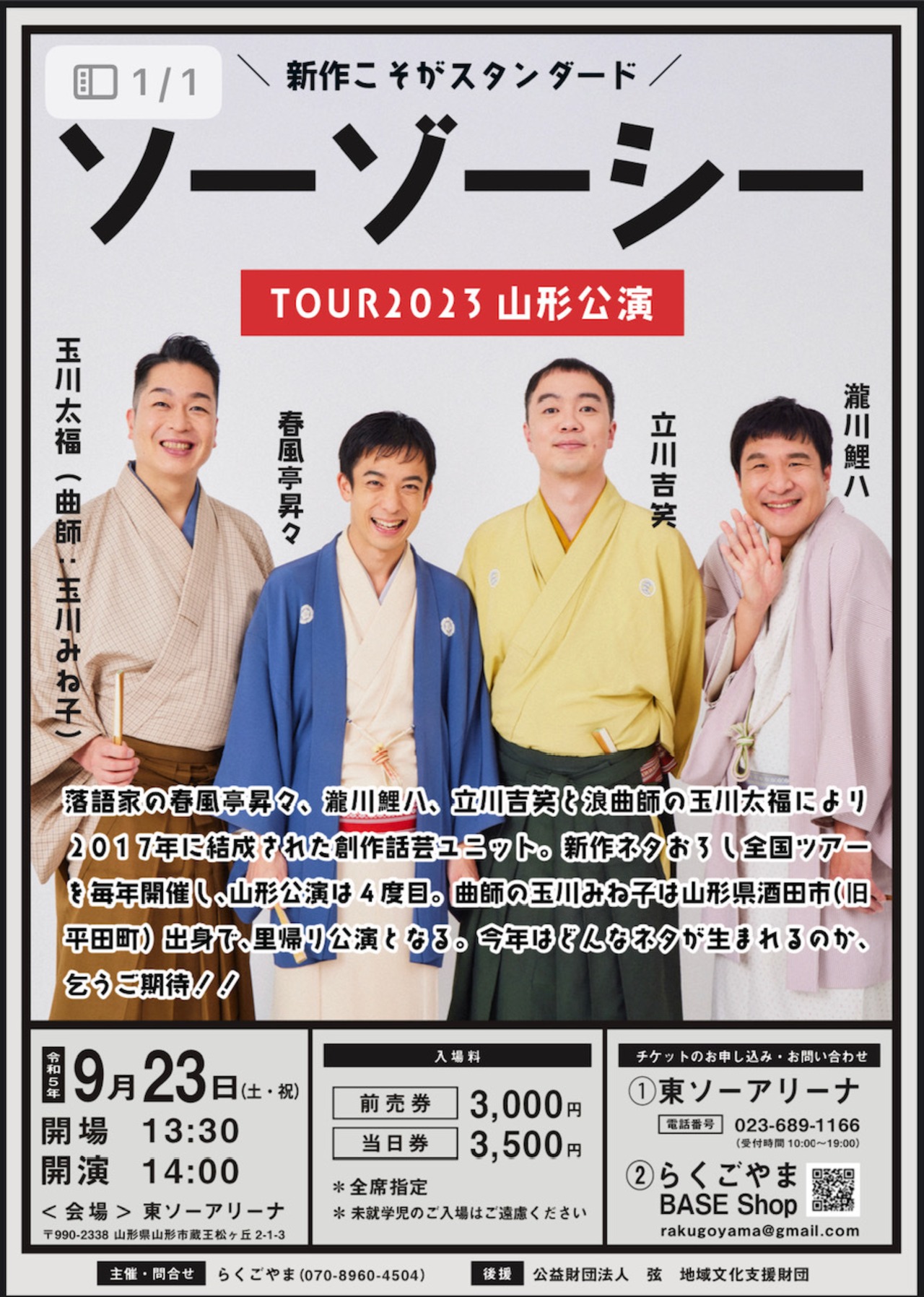 今年もソーゾーシーが山形にやってくる!春風亭昇々・瀧川鯉八・立川吉笑・玉川太福による至高の新作話芸をお楽しみください!